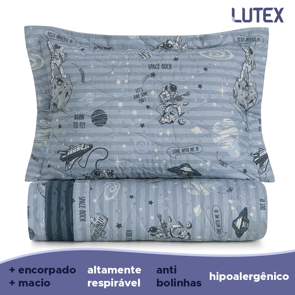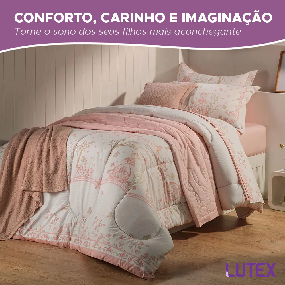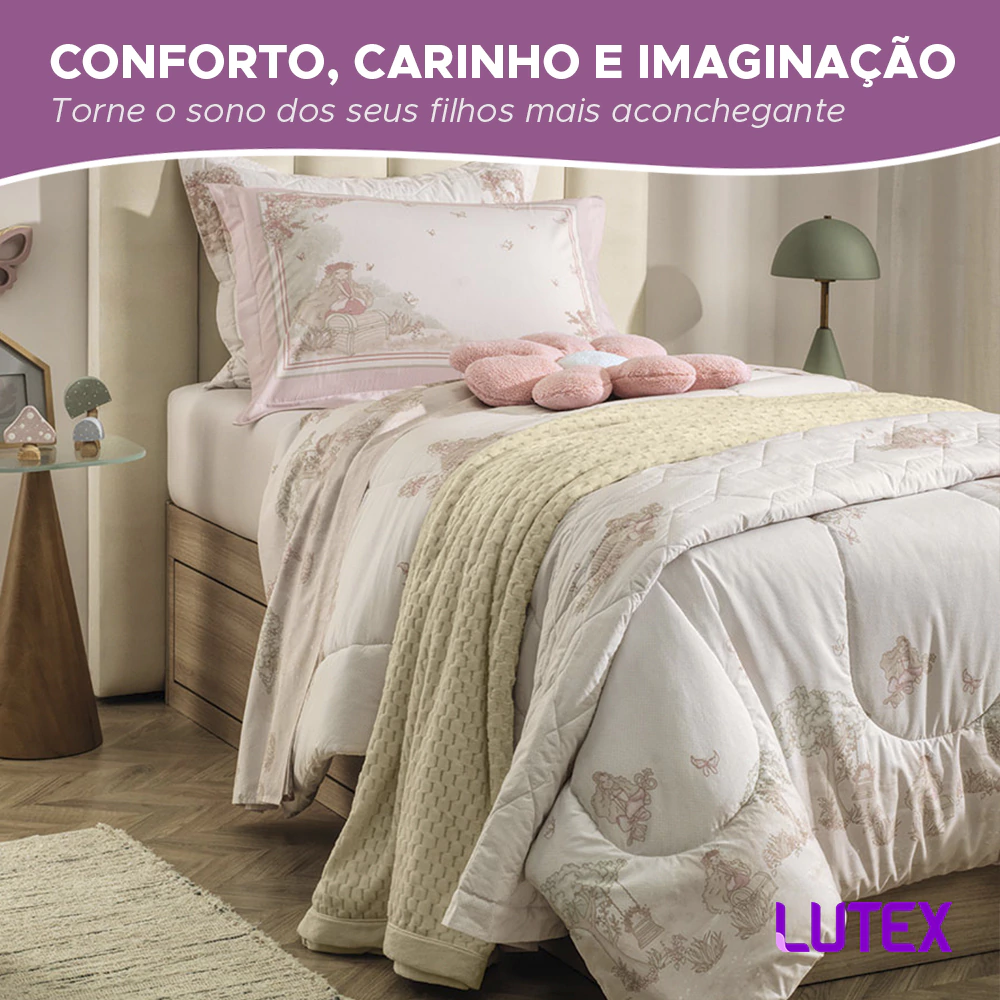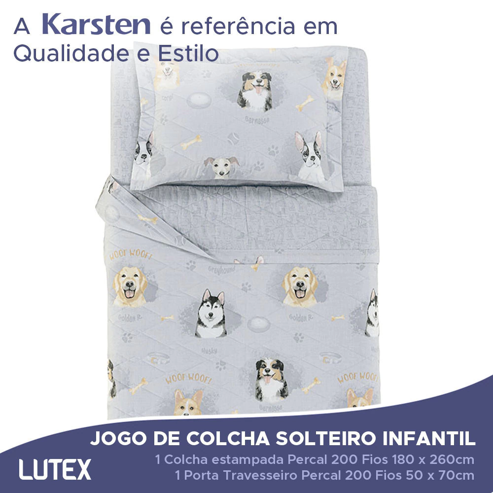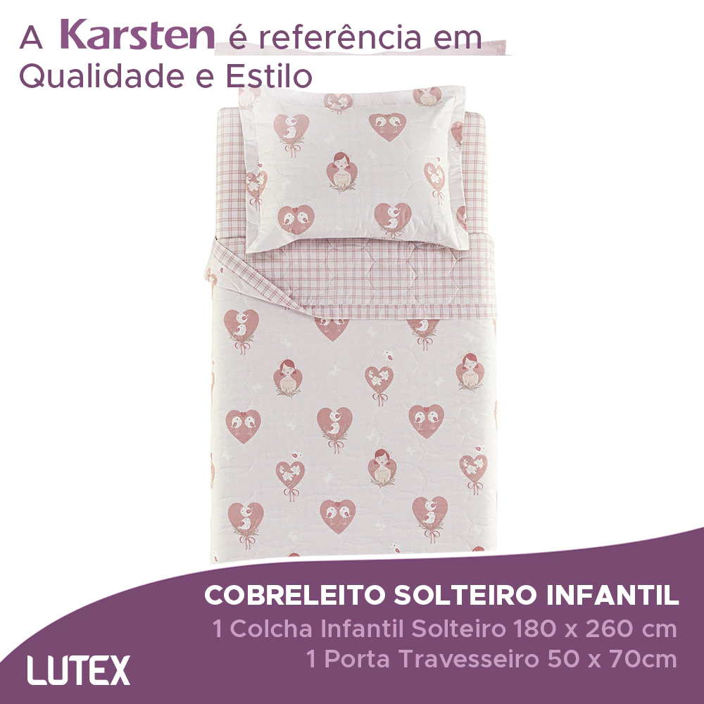 A Karsten pensou com muito carinho em sua linha infantil para tornar o sono de seus filhos mais aconchegante. Os temas infantis inspiram sonhos e fantasias. O toque do tecido 100% algodão percal 200 fios transforma a noite de sono ainda mais agradável com a maciez e o toque suave do algodão. O cobre leito acompanha o porta travesseiro e ambos possuem trabalhado em matelassê.