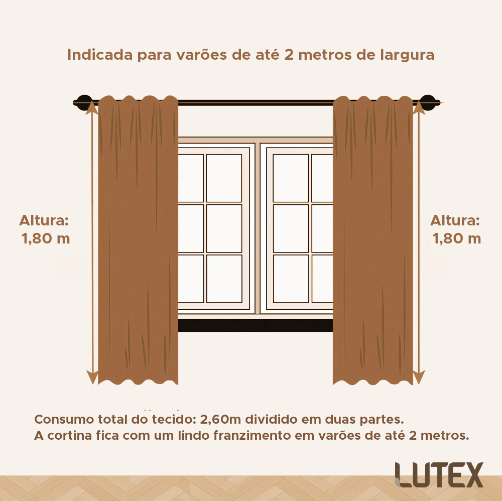 Consumo Total do Tecido: 2,60m dividido em duas partes, deixando a cortina com um lindo franzimento em varões de até 2 metros.