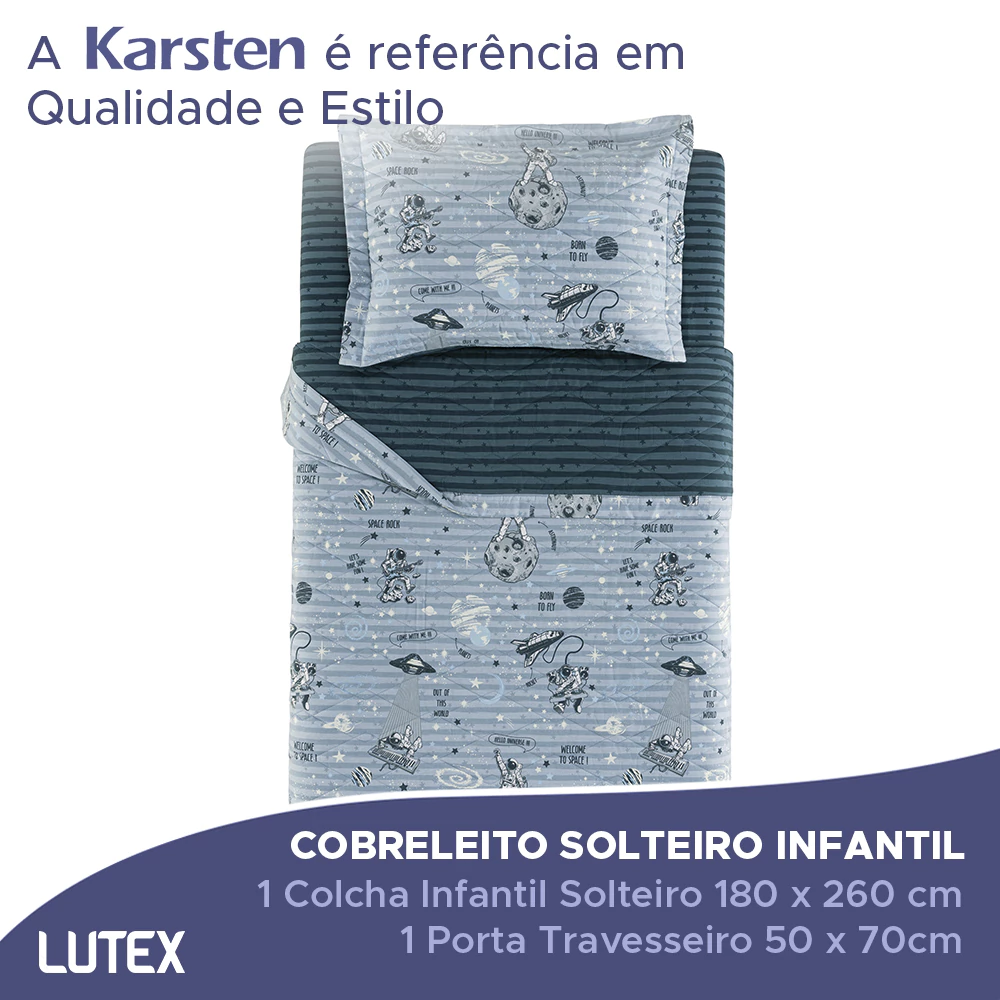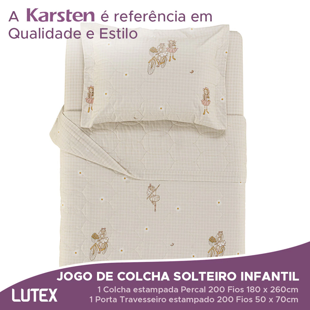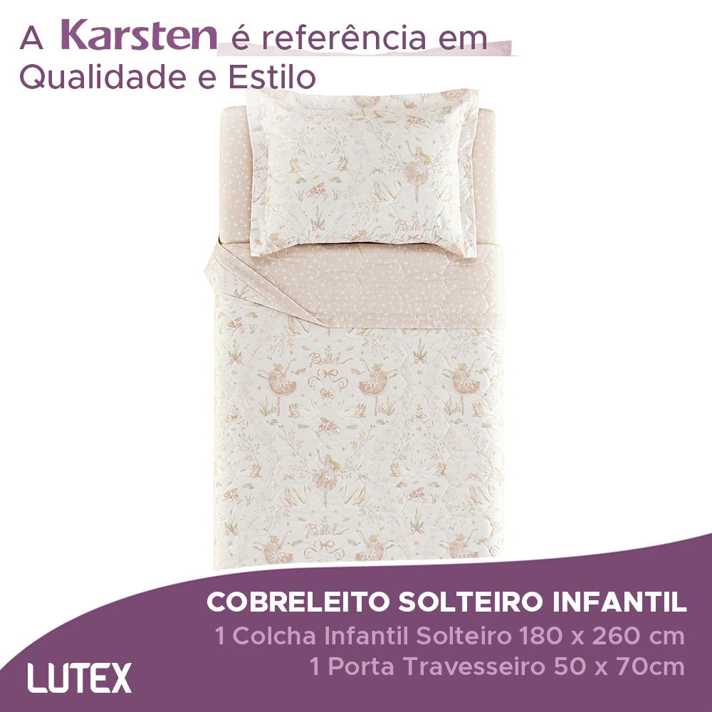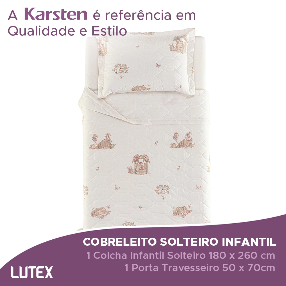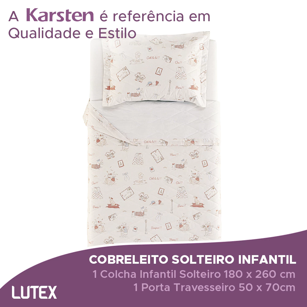 A Karsten pensou com muito carinho em sua linha infantil para tornar o sono de seus filhos mais aconchegante. Os temas infantis inspiram sonhos e fantasias. O toque do tecido 100% algodão percal 200 fios transforma a noite de sono ainda mais agradável com a maciez e o toque suave do algodão. O cobre leito acompanha o porta travesseiro e ambos possuem trabalhado em matelassê.