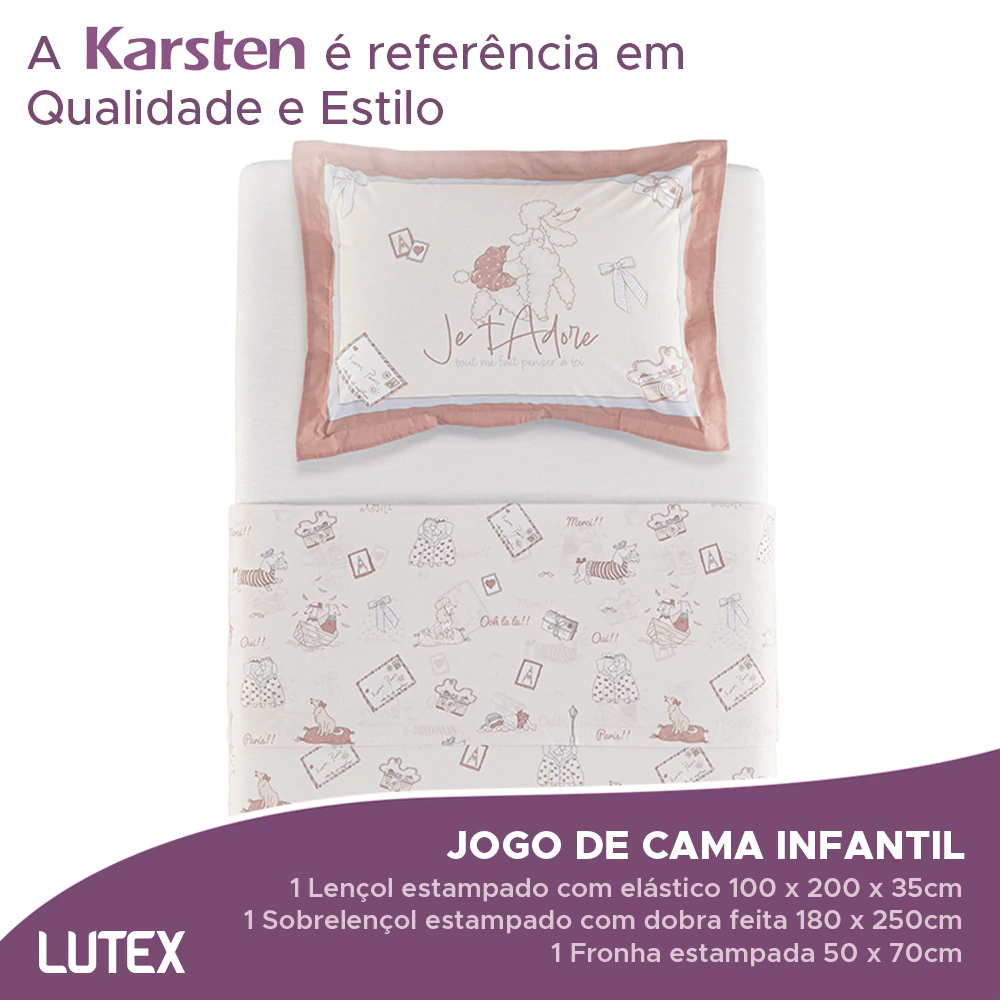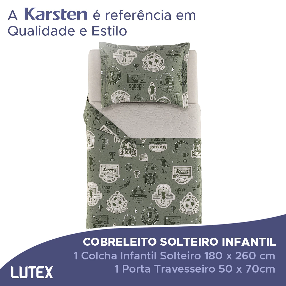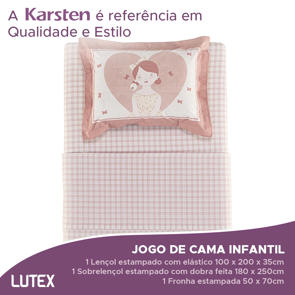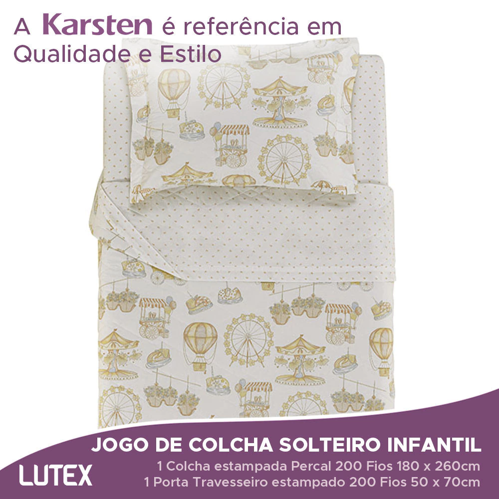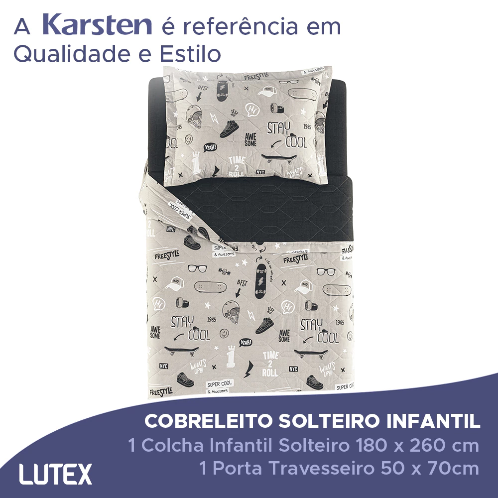 A Karsten pensou com muito carinho em sua linha infantil para tornar o sono de seus filhos mais aconchegante. Os temas infantis inspiram sonhos e fantasias. O toque do tecido 100% algodão percal 200 fios transforma a noite de sono ainda mais agradável com a maciez e o toque suave do algodão. O cobre leito acompanha o porta travesseiro e ambos possuem trabalhado em matelassê.