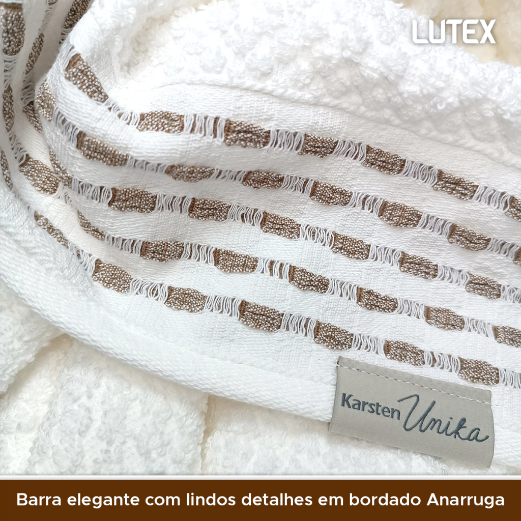 A linha de toalhas Karsten Chardon é confeccionada em tecido 100% algodão de altíssima qualidade. Sua alta gramatura de 430 g/m² com corpo felpudo em fio cardado proporciona ótima absorção e toque super macio e suave, além de promover ótima absorção e secagem eficiente. Suas cores modernas com estilo cosmopolita trazem o charme que seu ambiente precisa.