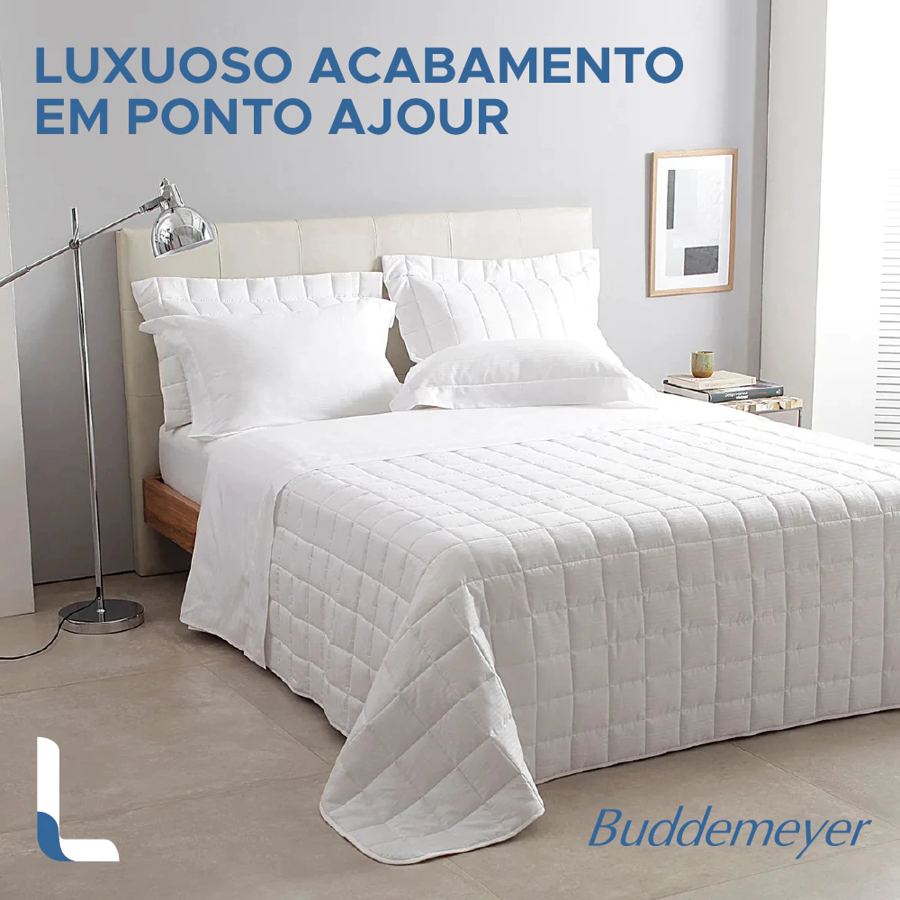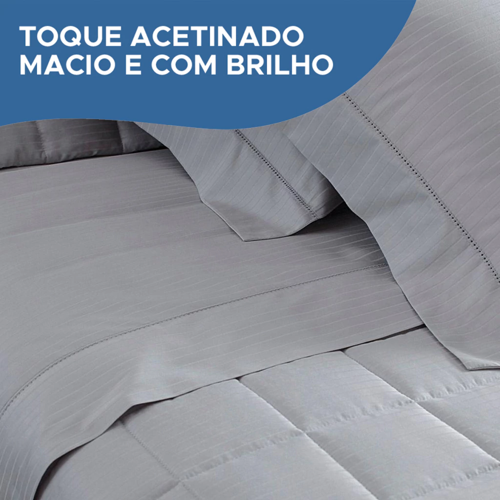 Em tecido 100% algodão Fio Penteado, cetim 300 fios de excelente qualidade, a coleção Damask Stripes da Buddemeyer conta com o luxuoso acabamento em ponto ajour e tecido adamascado com desenhos de listras foscas e brilhantes. É um produto sofisticado que proporciona um toque acetinado, macio e com brilho.