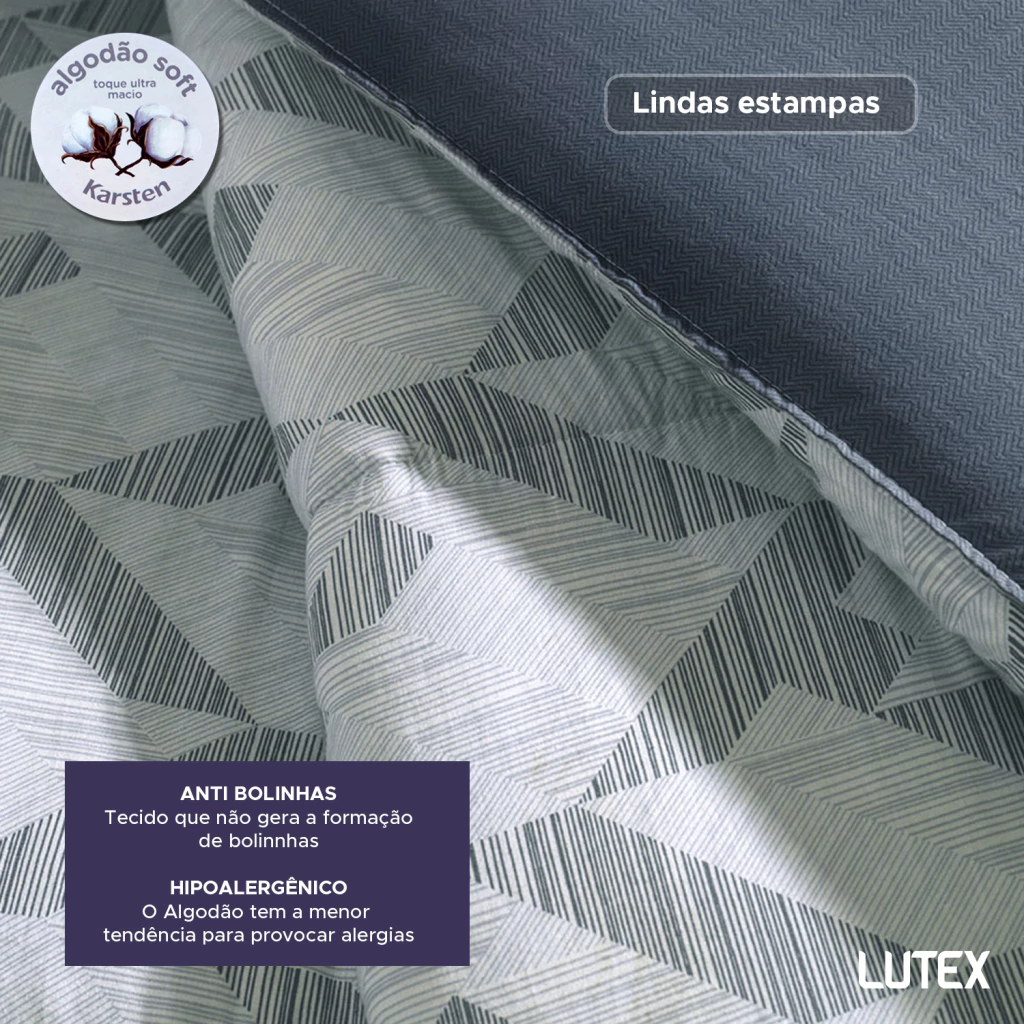 A linha de cama Karsten 160 Fios Percal 100% Algodão tem estampas em cores neutras, que transmitem serenidade e frescor no olhar. Este jogo leva o selo de algodão soft pois é fabricado em um processo inovador de acabamento têxtil e finalizado em calandra, que resulta em conforto que remete a aconchego e tranquilidade, criando um ambiente propício ao descanso e noites revigorantes.