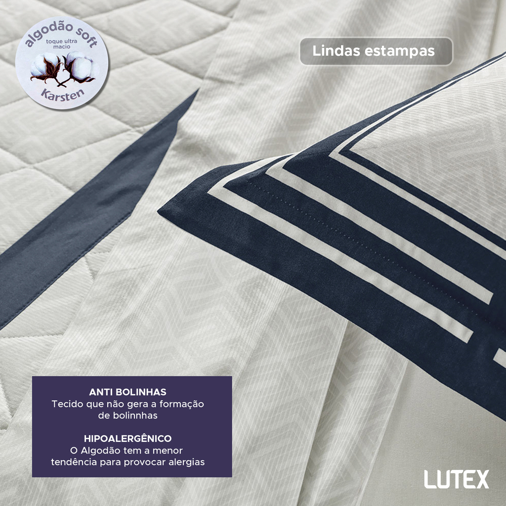 A linha de cama Karsten 200 Fios Percal 100% Algodão Dobra Feita tem estampas em cores neutras, que transmitem serenidade e frescor no olhar. Este jogo leva o selo de algodão soft pois é fabricado em um processo inovador de acabamento têxtil e finalizado em calandra, que resulta em conforto que remete a aconchego e tranquilidade, criando um ambiente propício ao descanso e noites revigorantes.