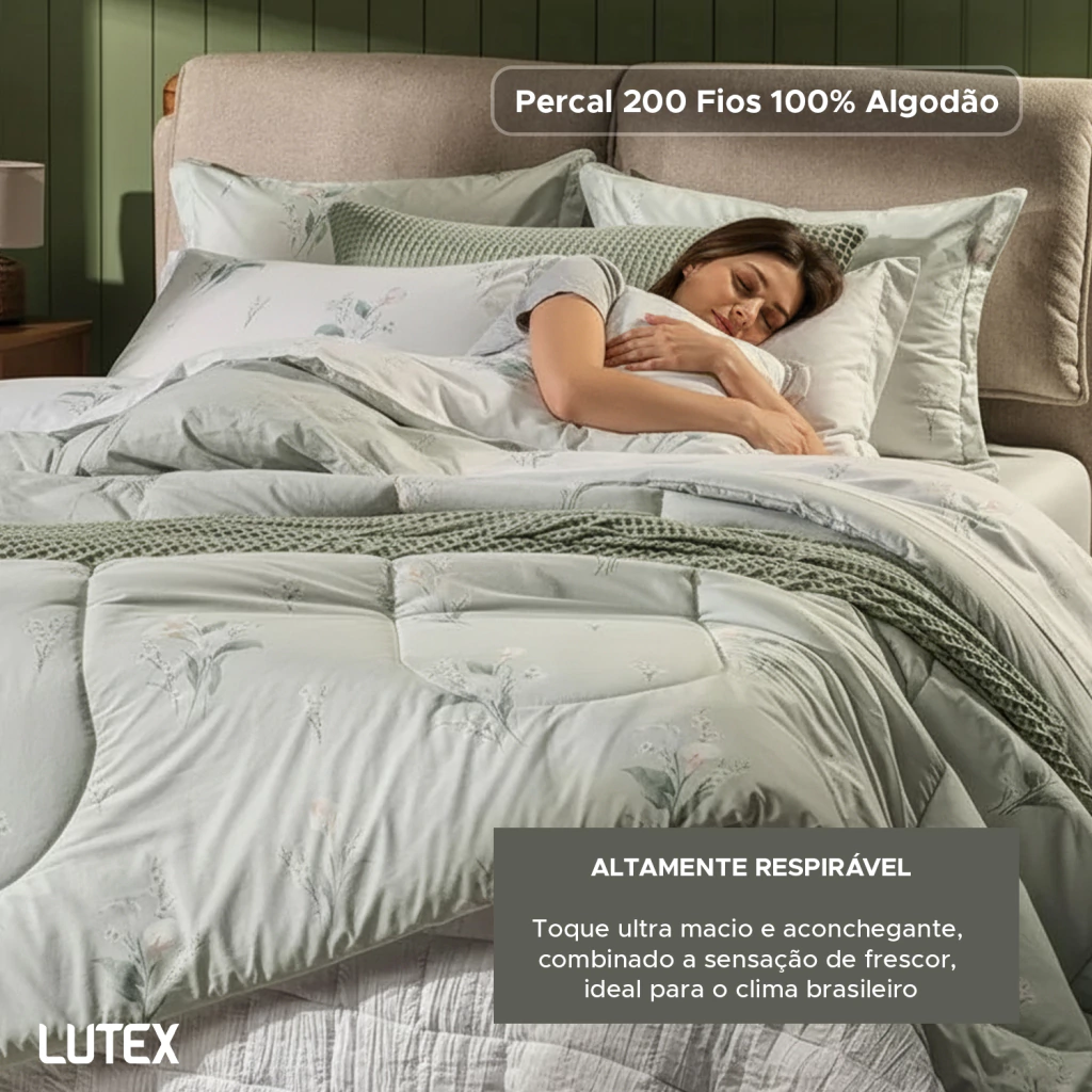 O tecido é confeccionado em Percal 200 Fios 100% Algodão, um tecido de trama bem fechada que resulta em toque ultra macio e aconchegante, combinado a sensação de frescor, ideal para o clima brasileiro.