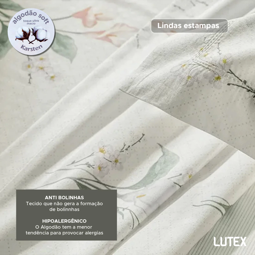 A linha de cama Karsten 200 Fios Percal 100% Algodão Dobra Feita tem estampas em cores neutras, que transmitem serenidade e frescor no olhar. Este jogo leva o selo de algodão soft pois é fabricado em um processo inovador de acabamento têxtil e finalizado em calandra, que resulta em conforto que remete a aconchego e tranquilidade, criando um ambiente propício ao descanso e noites revigorantes.