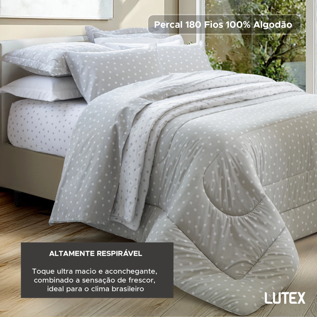 O tecido é confeccionado em Percal 180 Fios 100% Algodão, um tecido de trama bem fechada que resulta em toque ultra macio e aconchegante, combinado a sensação de frescor, ideal para o clima brasileiro. Além disso possui tratamento anti-pilling, que evita a indesejadas bolinhas no tecido e é super facial de passar.
