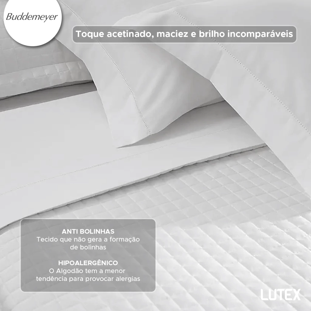 Em tecido 100% algodão Fio Penteado, cetim 300 fios de excelente qualidade, a coleção Bud Colors da Buddemeyer conta com o luxuoso acabamento em ponto ajour e tecido brilhoso com toque acetinado, que traz toda a elegância. É um produto sofisticado que proporciona um toque acetinado, macio e com brilho.