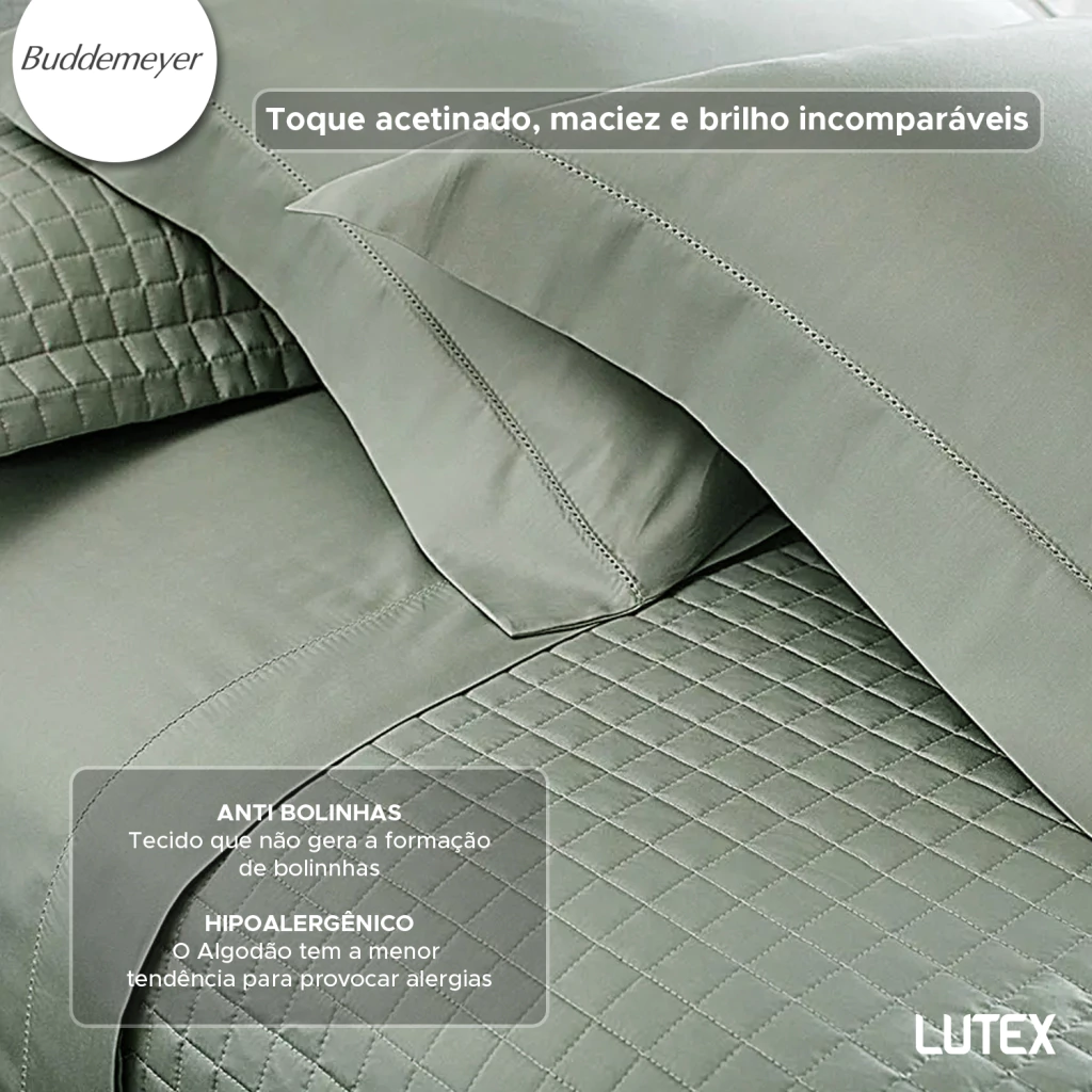 Em tecido 100% algodão Fio Penteado, cetim 300 fios de excelente qualidade, a coleção Bud Colors da Buddemeyer conta com o luxuoso acabamento em ponto ajour e tecido brilhoso com toque acetinado, que traz toda a elegância. É um produto sofisticado que proporciona um toque acetinado, macio e com brilho.