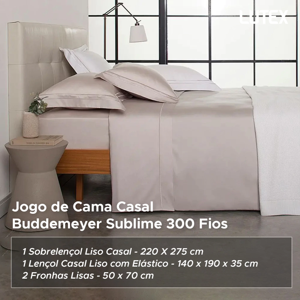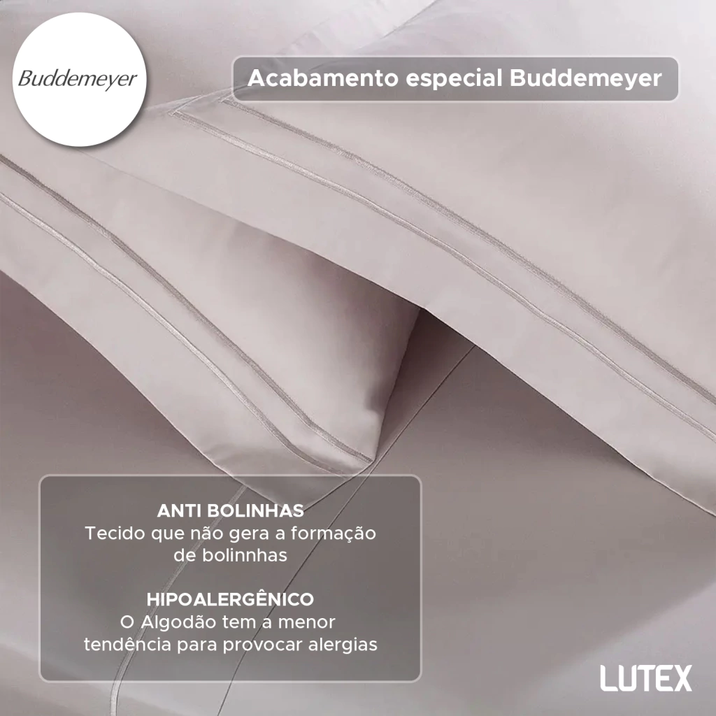 O aconchegante jogo de lençol acetinado, em 300 fios de puro algodão com fibras longas e tecnologia de ponta, recebe refinado acabamento em ponto cheio na moldura do sobrelençol e fronhas, criando uma combinação inigualável entre elementos da alta-costura com extremo conforto e maciez, para momentos relaxantes e repletos de bem-estar. Além disso, acompanha embalagem no mesmo tecido do lençol, com a marca Buddemeyer bordada em ponto cheio, para ajudar a manter seu armário mais belo e organizado no dia a dia.