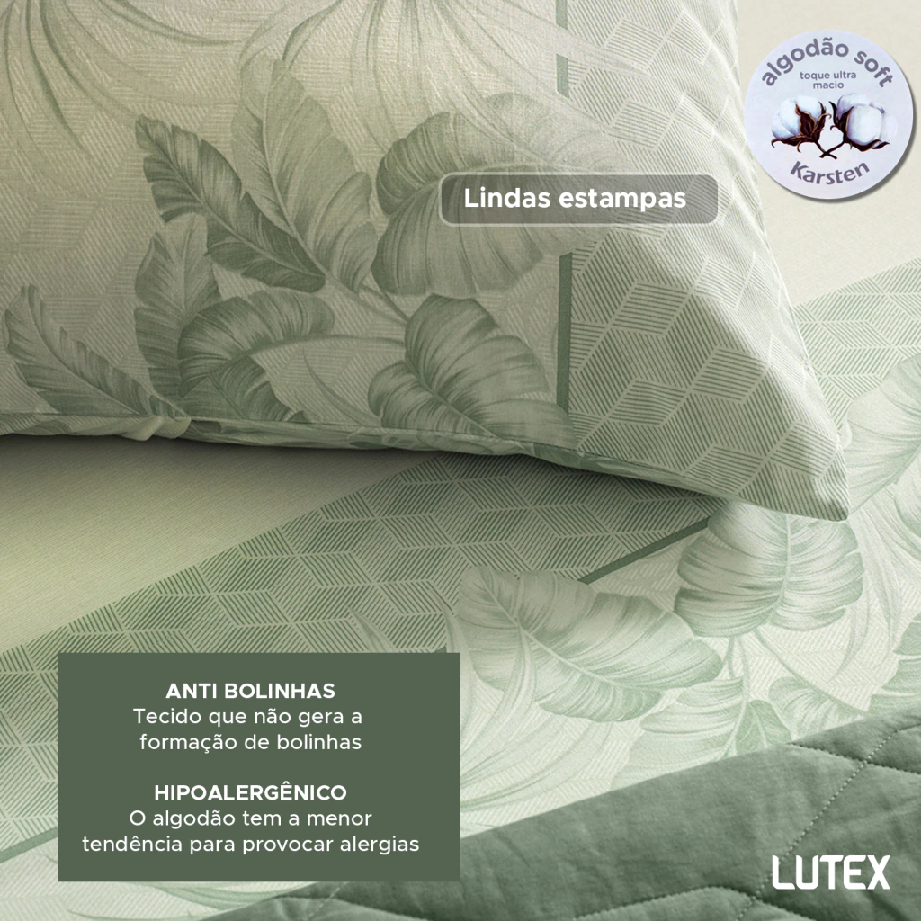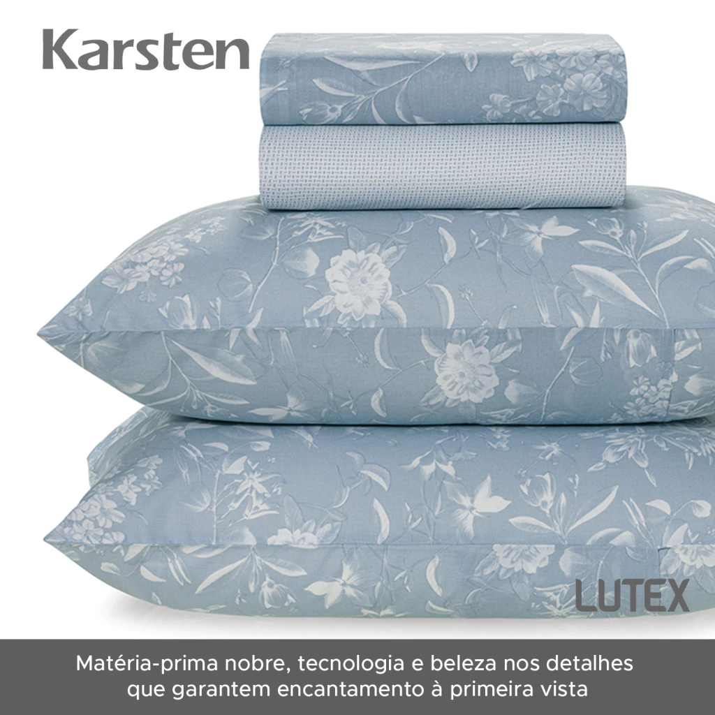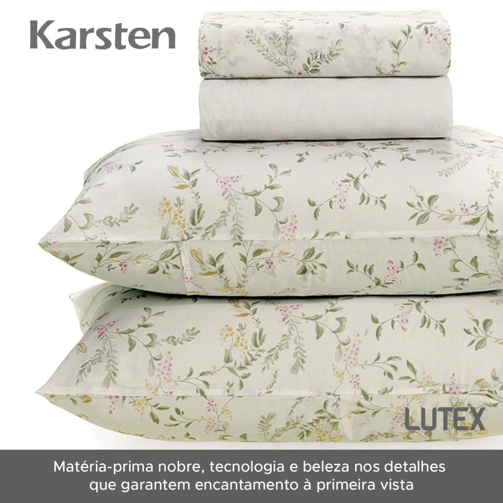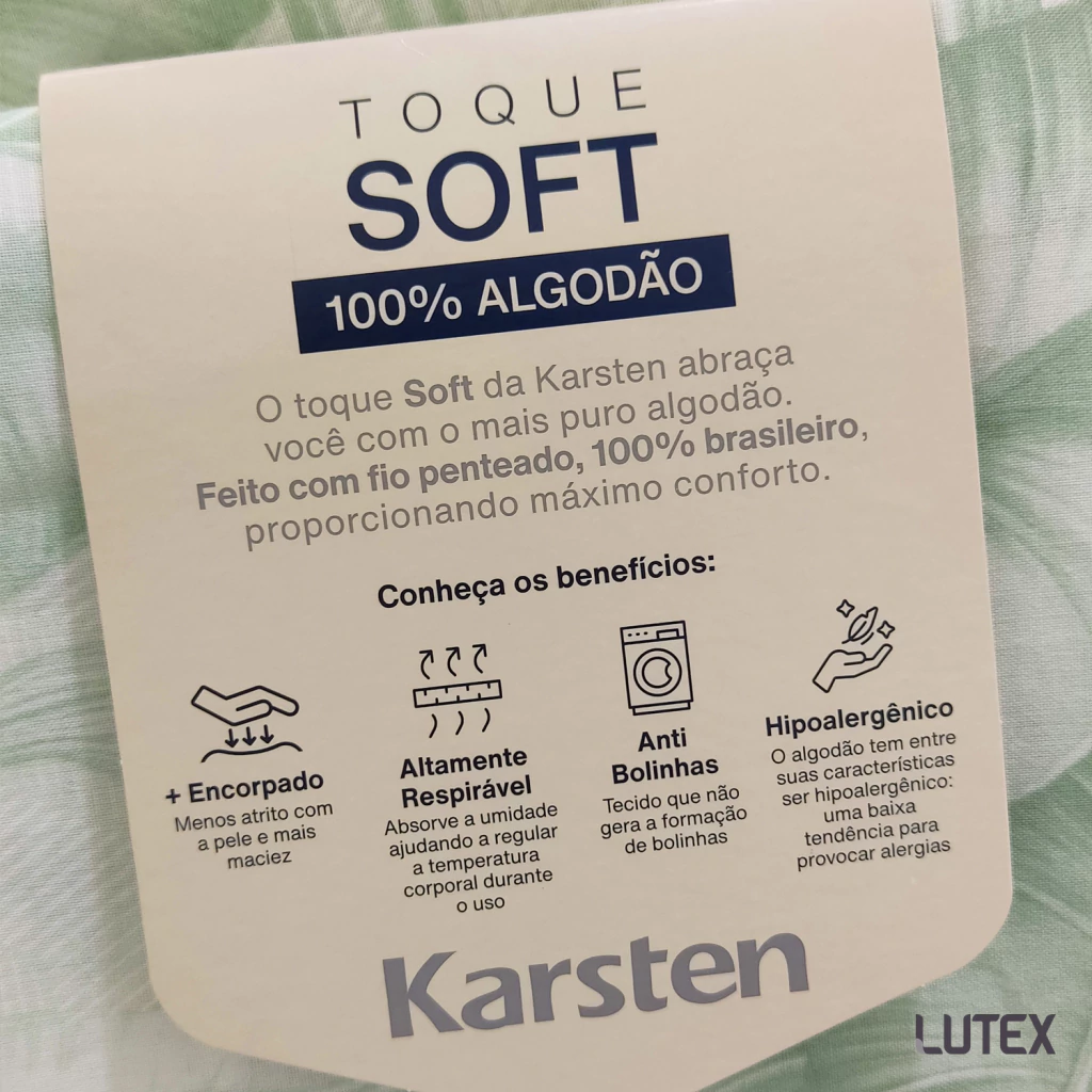 A linha de cama Karsten 160 Fios Percal 100% Algodão tem estampas em cores neutras, que transmitem serenidade e frescor no olhar. Este jogo leva o selo de algodão soft pois é fabricado em um processo inovador de acabamento têxtil e finalizado em calandra, que resulta em conforto que remete a aconchego e tranquilidade, criando um ambiente propício ao descanso e noites revigorantes.
