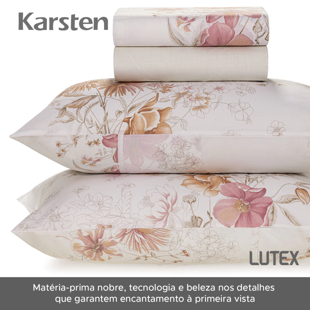 A linha de cama Karsten 160 Fios Percal 100% Algodão tem estampas em cores neutras, que transmitem serenidade e frescor no olhar. Este jogo leva o selo de algodão soft pois é fabricado em um processo inovador de acabamento têxtil e finalizado em calandra, que resulta em conforto que remete a aconchego e tranquilidade, criando um ambiente propício ao descanso e noites revigorantes.