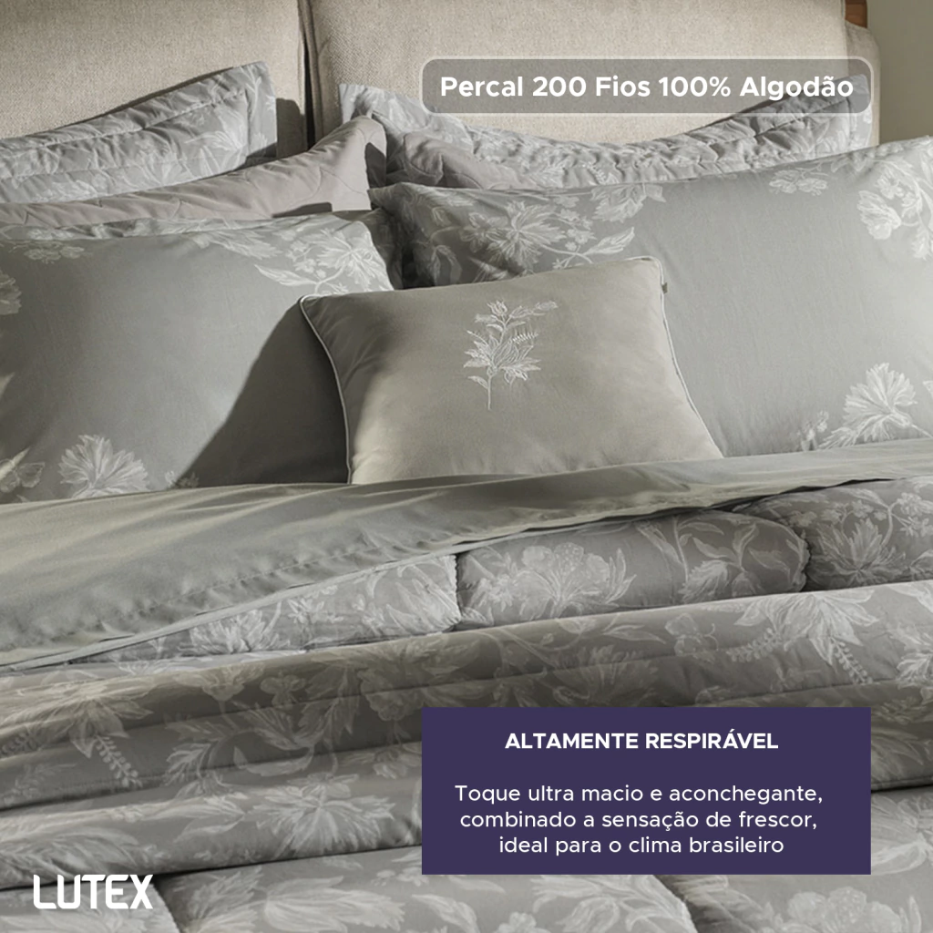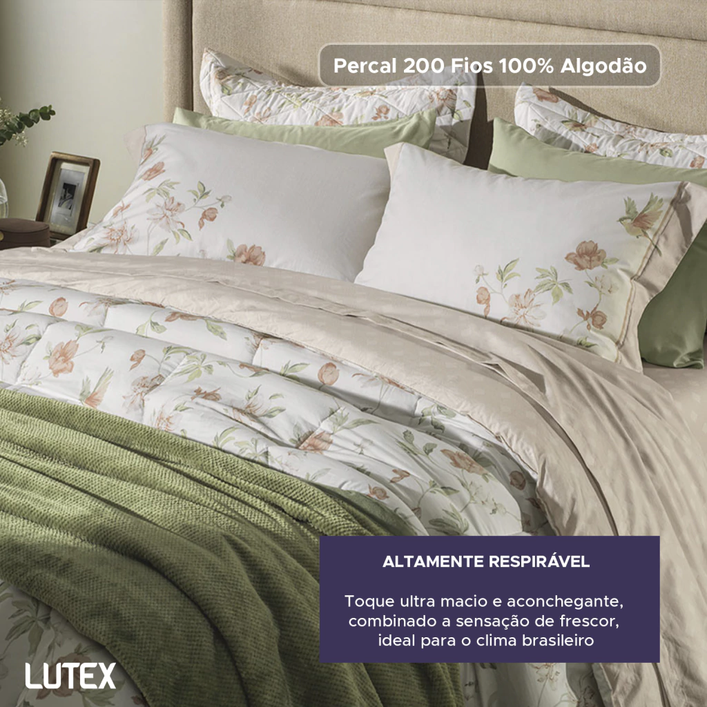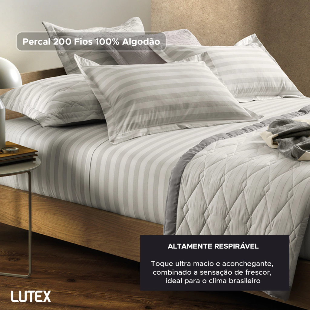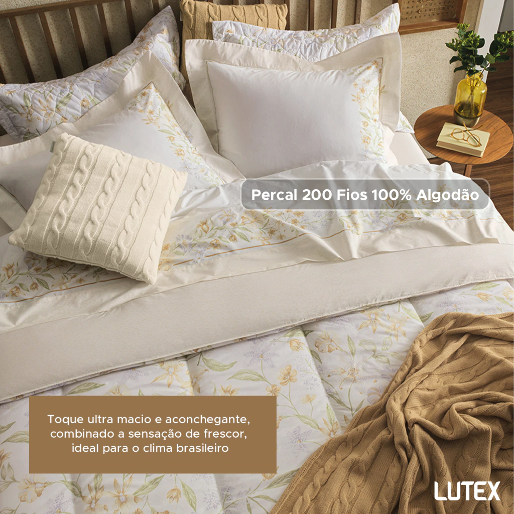 O tecido é confeccionado em Percal 200 Fios 100% Algodão, um tecido de trama bem fechada que resulta em toque ultra macio e aconchegante, combinado a sensação de frescor, ideal para o clima brasileiro.