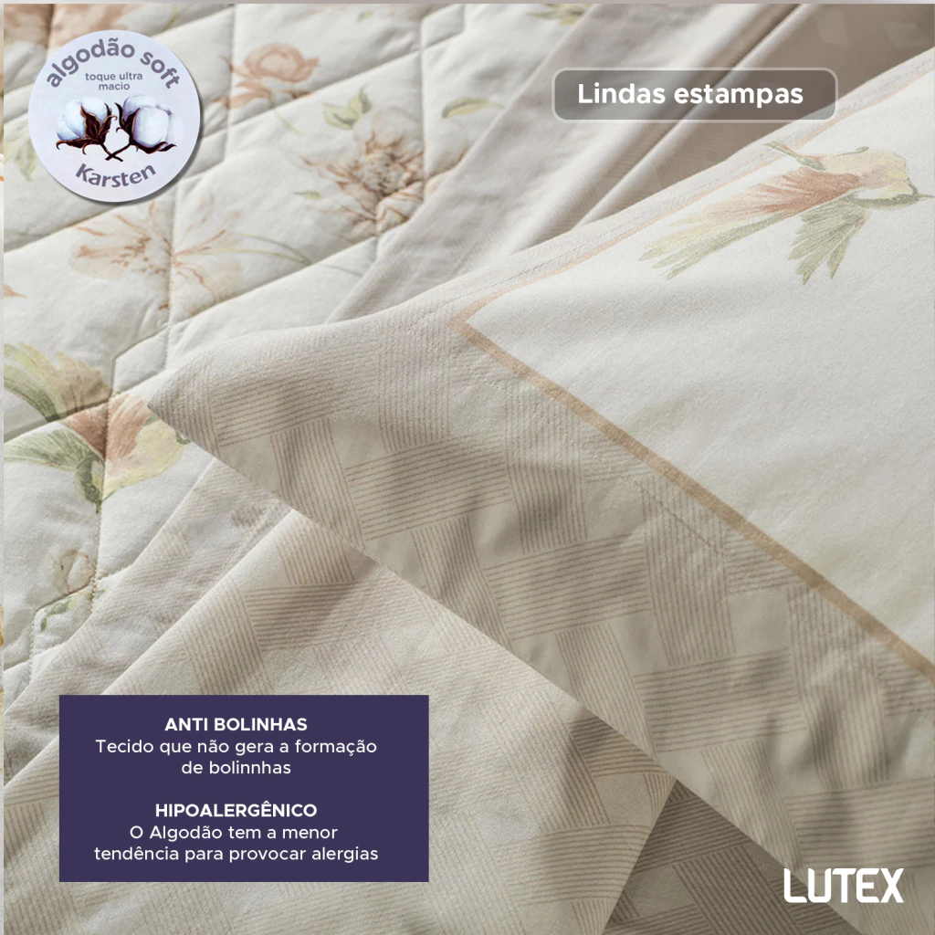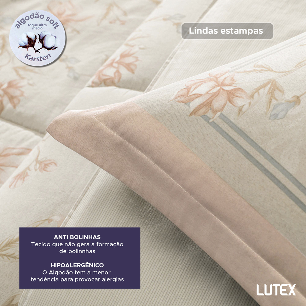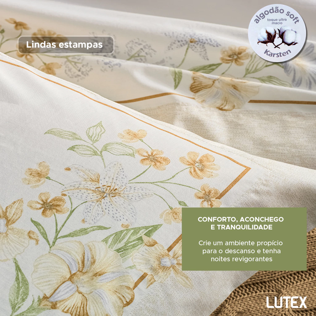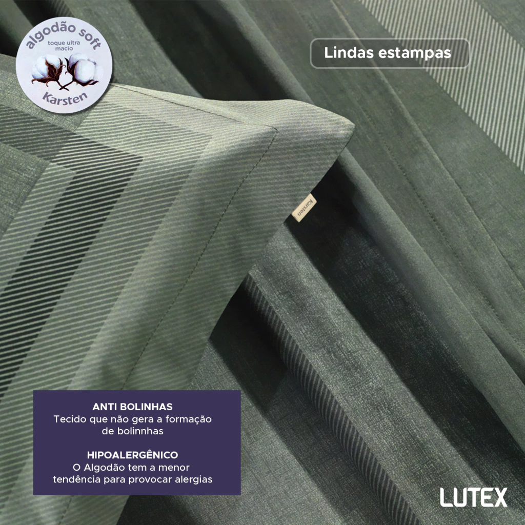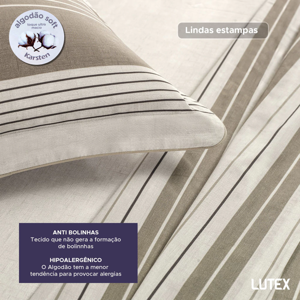 A linha de cama Karsten 200 Fios Percal 100% Algodão Dobra Feita tem estampas em cores neutras, que transmitem serenidade e frescor no olhar. Este jogo leva o selo de algodão soft pois é fabricado em um processo inovador de acabamento têxtil e finalizado em calandra, que resulta em conforto que remete a aconchego e tranquilidade, criando um ambiente propício ao descanso e noites revigorantes.