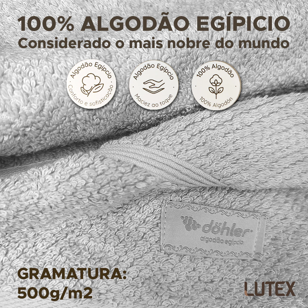 Confeccionada em 100% ALGODÃO EGÍPCIO, com gramatura de 500g/m² com toda a sofisticação da Dohler, com fibras de algodão selecionadas, mais longas, resistentes e macias, transformadas em fios diferenciados que deixam a toalha encorpada e com uma maciez fantástica, além do visual requintado e exclusivo.
