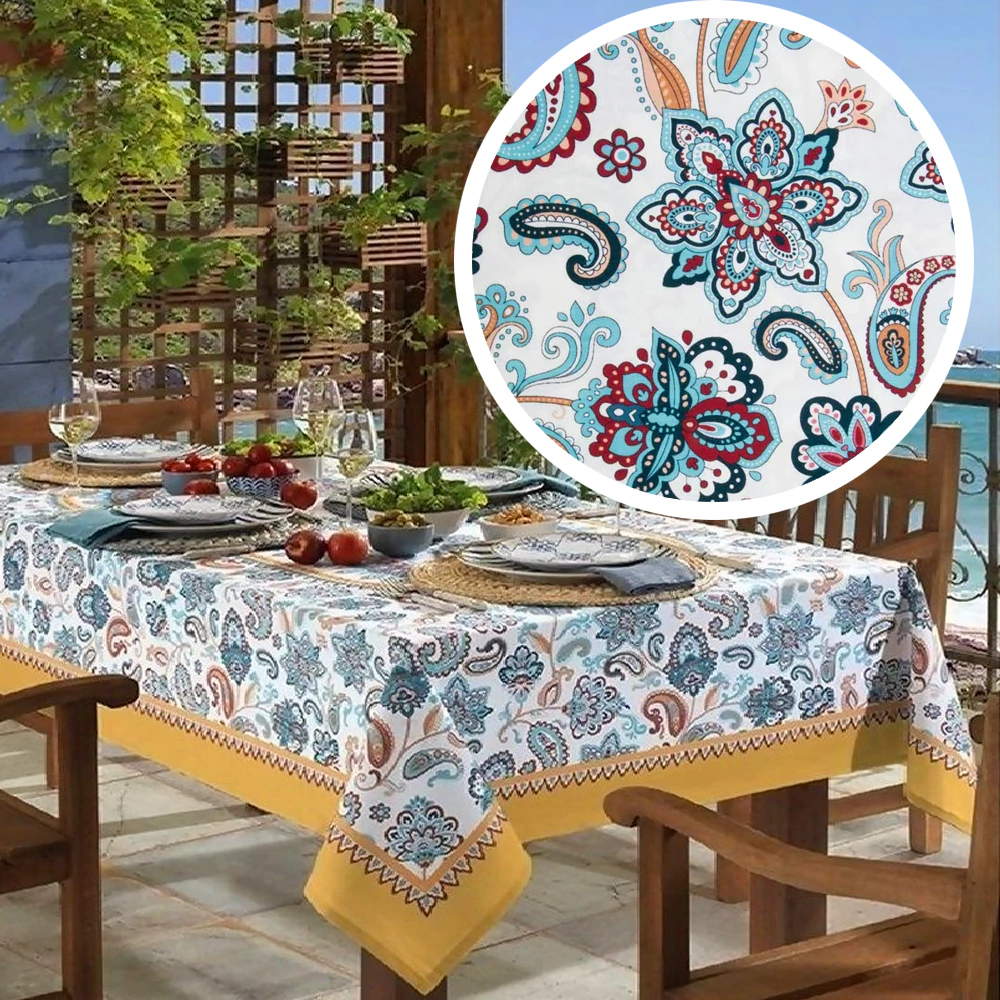 A Toalha de mesa Clean Renova é produzida utiilizando a tecnologia de estamparia Digital (eco-responsável) em tela de poliéster/algodão de fácil conservação.